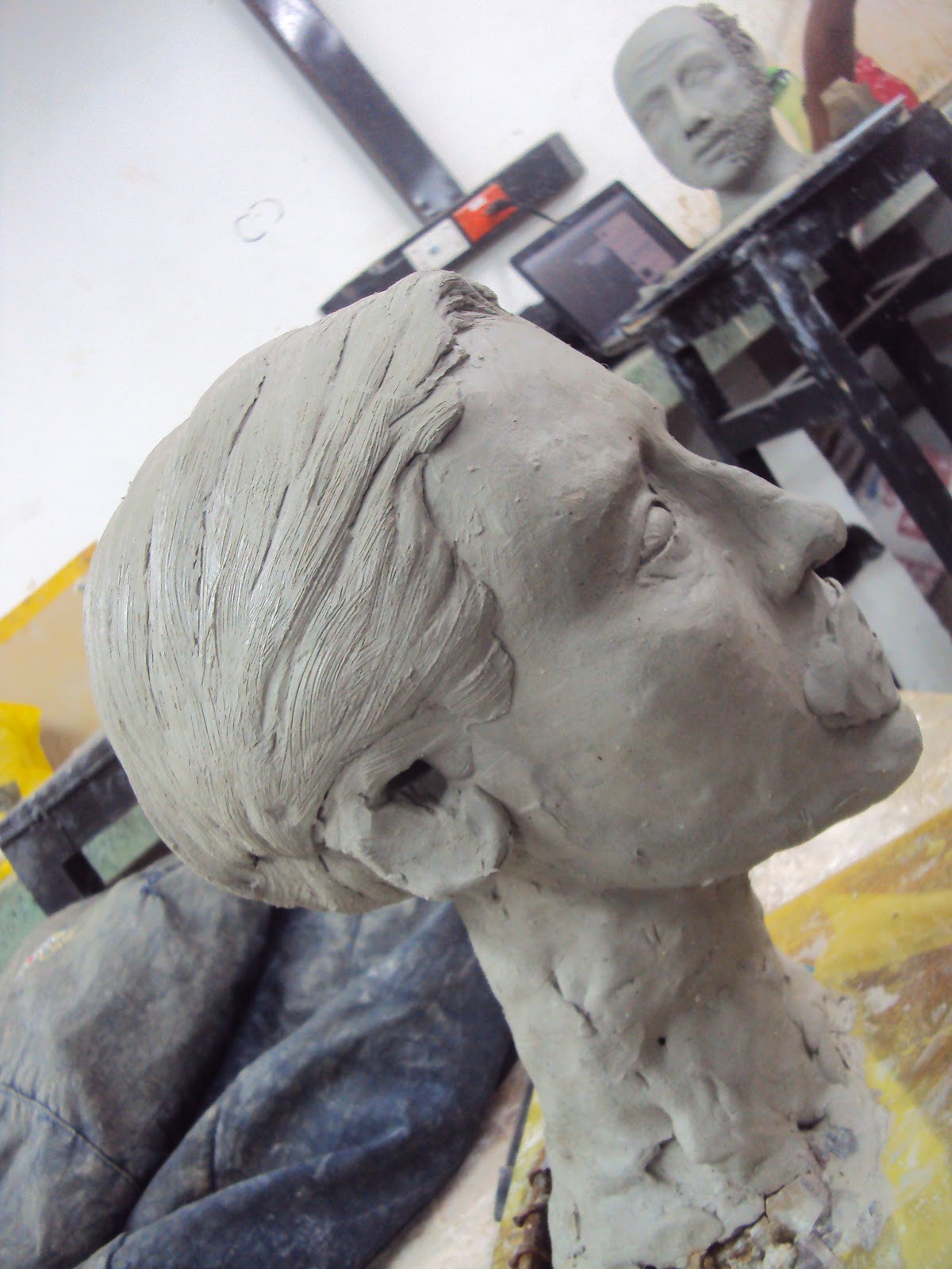 ya de ahí comenzamos a colocar la arcilla, se coloca una gran cantidad de arcilla encima de la esfera de periódico para comenzar a hacer la cabeza, debemos para esto tener en cuenta que, la cabeza vista de frente y de ambos lados tiene forma ovoide y por detrás tiene forma esférica